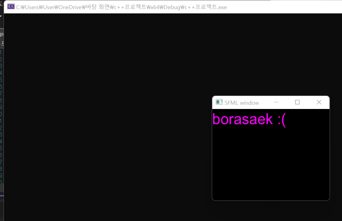 #include <SFML/Graphics.hpp> #include <string> #include <exception> int main(void) { sf::RenderWindow window(sf::VideoMode(400, 300), "SFML window"); // main window 생성 sf::Font font; if (!font.loadFromFile(R"(C:\Users\sssan\Library\Fonts\NanumFont\NanumGothic.ttf)")) throw std::exception("font error"); // 쓸 폰트 생성 sf::Text text("유선 hi", font, 50); text.setFillColor(sf::Color::Green); //글씨 색깔 //화면에 쓸 내용 while (window.isOpen()) //윈도우 루프 { sf::Event event; while (window.pollEvent(event)) if (event.type == sf::Event::Closed) window.close(); // 종료 여부체크 window.clear(); //화면청소 window.draw(text); //화면에 글쓰기 window.display(); //띄우기 } }폰트가 없어서 오류가 났다