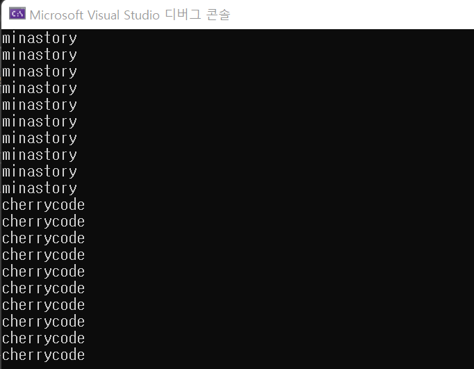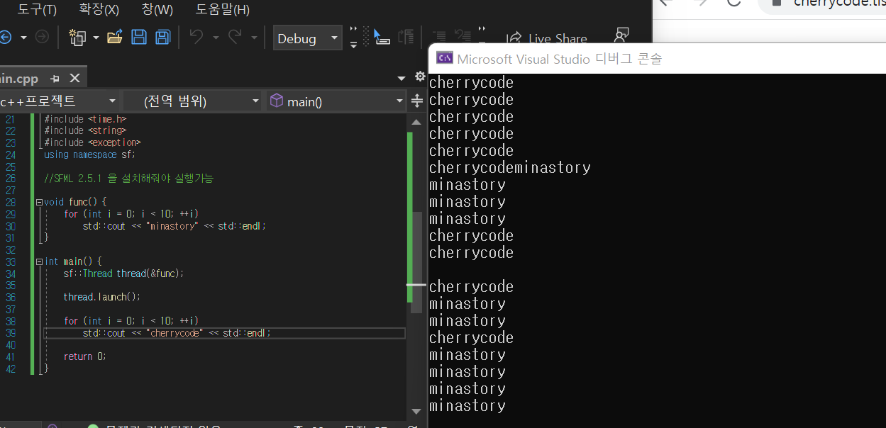 스레드 생성하는 클래스 sf::Thread #include <SFML/System.hpp> #include <iostream> void func() { // 이 함수는 thread.launch가 호출되면 시작된다 for (int i = 0; i < 10; ++i) std::cout << "minastory" << std::endl; } int main() { // 스레드와 함수의 시작점 만들기 sf::Thread thread(&func); // run it thread.launch(); // the main thread continues to run... for (int i = 0; i < 10; ++i) std::cout << "cherrycode" << std::endl; return 0; }결과