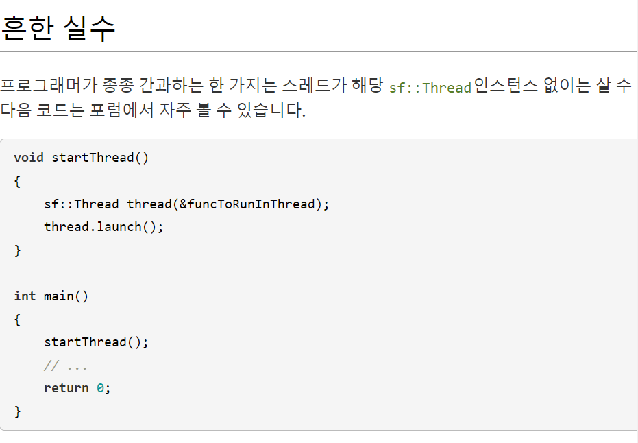 class ClassWithThread { public: ClassWithThread() : m_thread(&ClassWithThread::f, this) //직접초기화 { } private: void f() { ... } sf::Thread m_thread; };스레드 시작