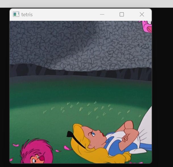 #include <SFML/Graphics.hpp> #include <cassert> #include <stdio.h> #include <iostream> #include <windows.h> #include <conio.h> #include <stdlib.h> #include <SFML/Config.hpp> #include <SFML/System/Export.hpp> using namespace std; using namespace sf; int main() { Texture texture; texture.loadFromFile("C:/Users/User/OneDrive/사진/alice.jpg"); Sprite sprite; sprite.setTexture(texture); sprite.setTextureRect(IntRect(0 ,0, 500, 500)); //0,0위치에 500*500 사이즈로 로드 RenderWindow window(VideoMode(500, 500), "tetris"); //window.setFramerateLimit(60); while (window.isOpen()) { Event event; while (window.pollEvent(event)) { if (!texture.loadFromFile("C:/Users/User/OneDrive/사진/alice.jpg")) return -1; // Assign it to a sprite sprite.setTexture(texture); // Draw the textured sprite window.clear(); window.draw(sprite); window.display(); } } return 0; }여러가지 오류가 많았다...