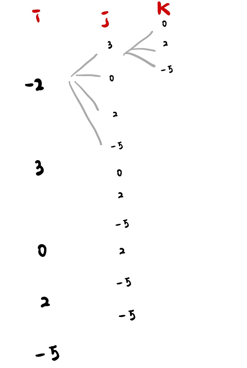i= -2 ,j=3,k=0 ; i=-2, j=3, k=2; 이런 식으로 조합하는거다 .. 말로 설명하니 어렵군