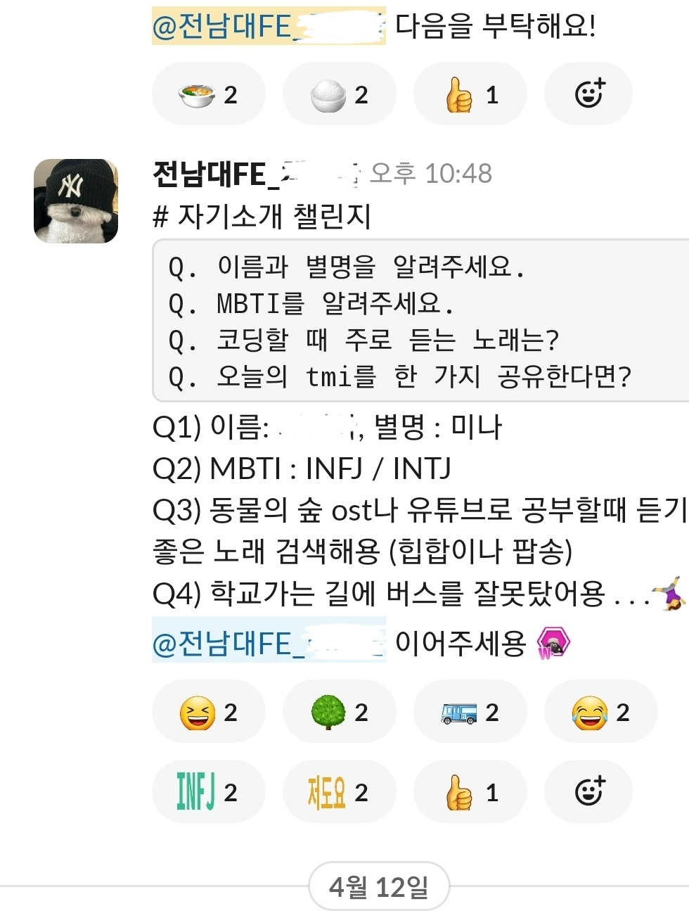 지금은 1단계라서, 프로젝트 팀이 아니라 서로 정보를 공유하고 같이 공부하는 팀 !? (가끔 팀미션도 있음) 정도로 생각하면 될 듯 ⌣̈